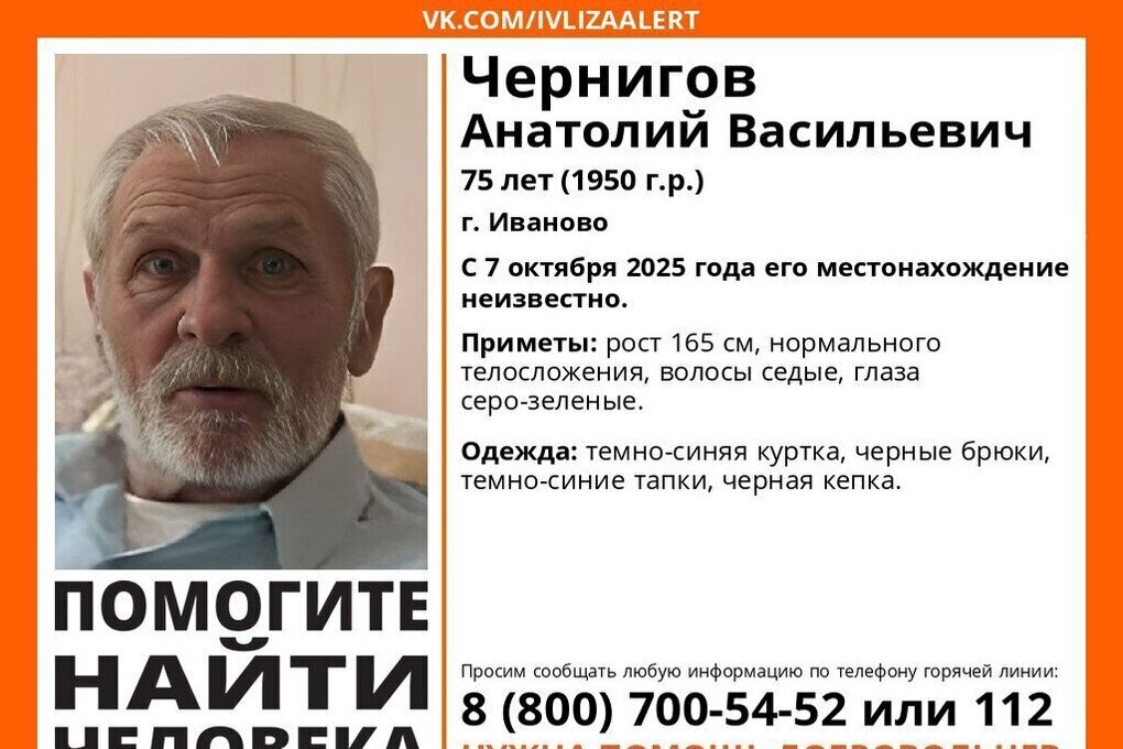 75-летний Анатолий Чернигов из Иваново, вышел из дома и не вернулся.