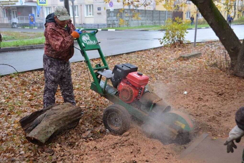 Убирают остатки деревьев с помощью пнедробилки, которая оснащена фрезой. Пень благодаря инструменту разрушают до глубины 15 – 20 сантиметров.
